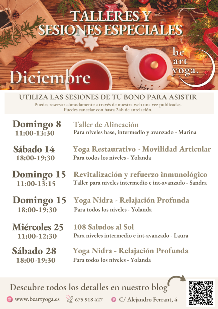 En diciembre, te invitamos a participar en nuestras sesiones especiales y talleres de yoga en Be Art Yoga, nuestro estudio en Arganzuela. Estas clases están diseñadas para todos los niveles, desde principiantes hasta practicantes avanzados. Explora una variedad de técnicas y estilos que te ayudarán a profundizar en tu práctica. Mejora tu bienestar y encuentra el equilibrio entre cuerpo y mente en un entorno acogedor y relajante.