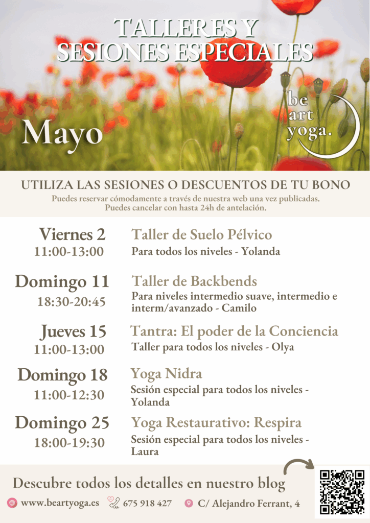 En mayo, te invitamos a participar en nuestras sesiones especiales y talleres de yoga en Be Art Yoga, nuestro estudio en Arganzuela. Estas clases están diseñadas para todos los niveles, desde principiantes hasta practicantes avanzados. Explora una variedad de técnicas y estilos que te ayudarán a profundizar en tu práctica. Mejora tu bienestar y encuentra el equilibrio entre cuerpo y mente en un entorno acogedor y relajante.